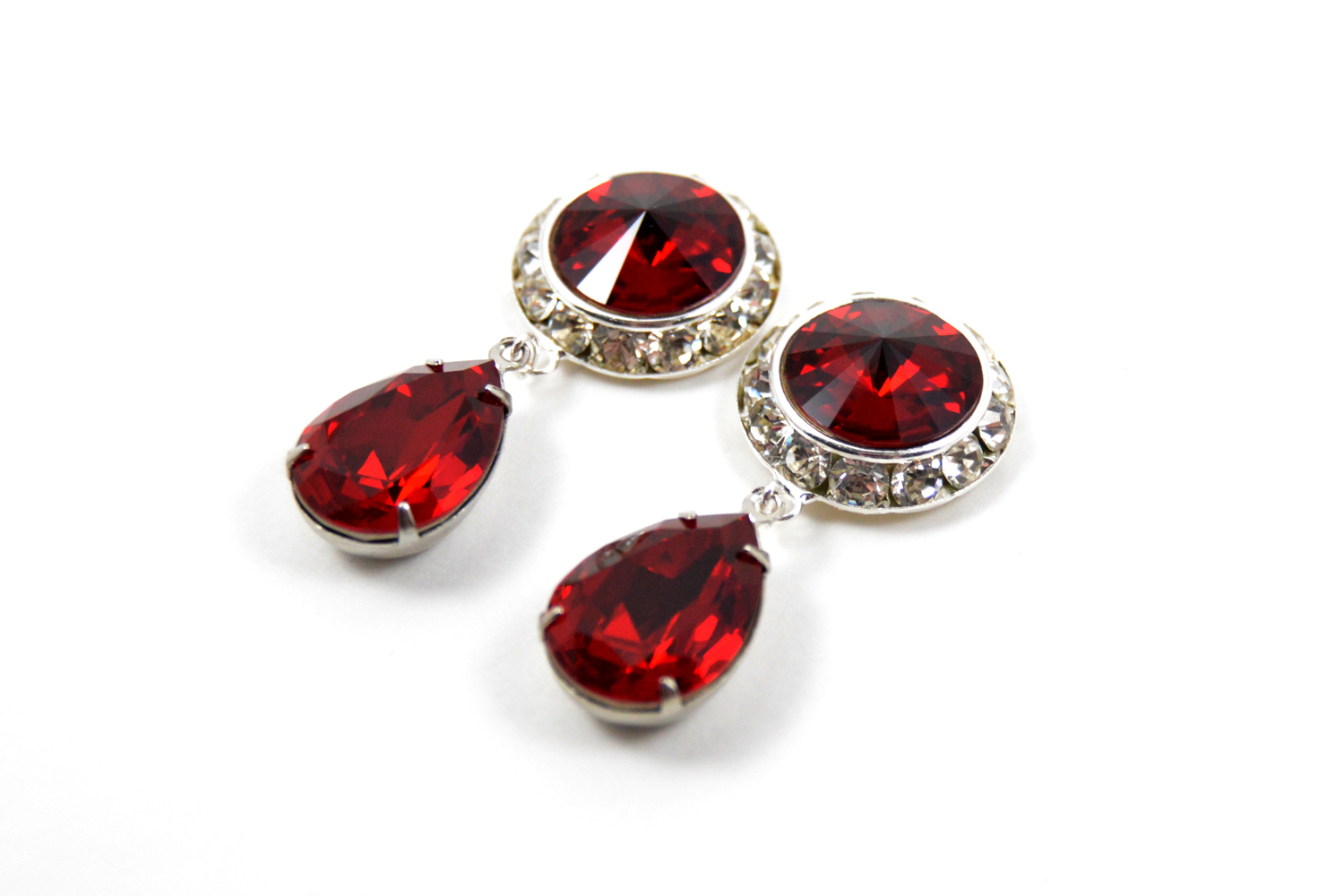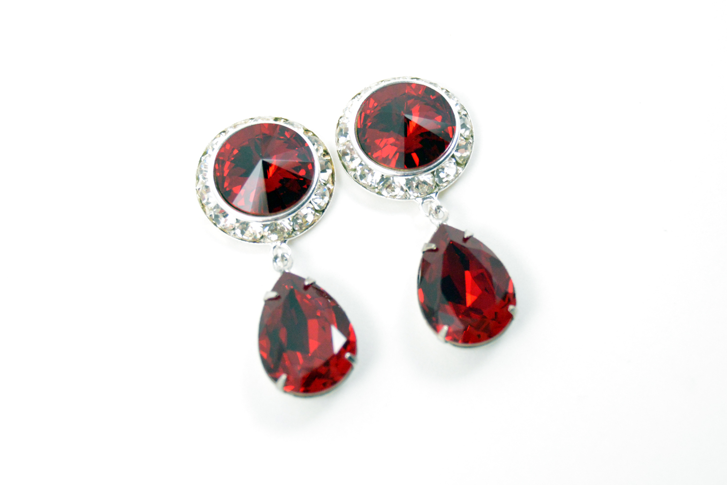 5/8 9/16 1/2 1 PAIR Siam Ruby Red Silver Dangle Hanging Ear Plugs Gauges Tunnels or Studs Made With SWAROVSKI Elements