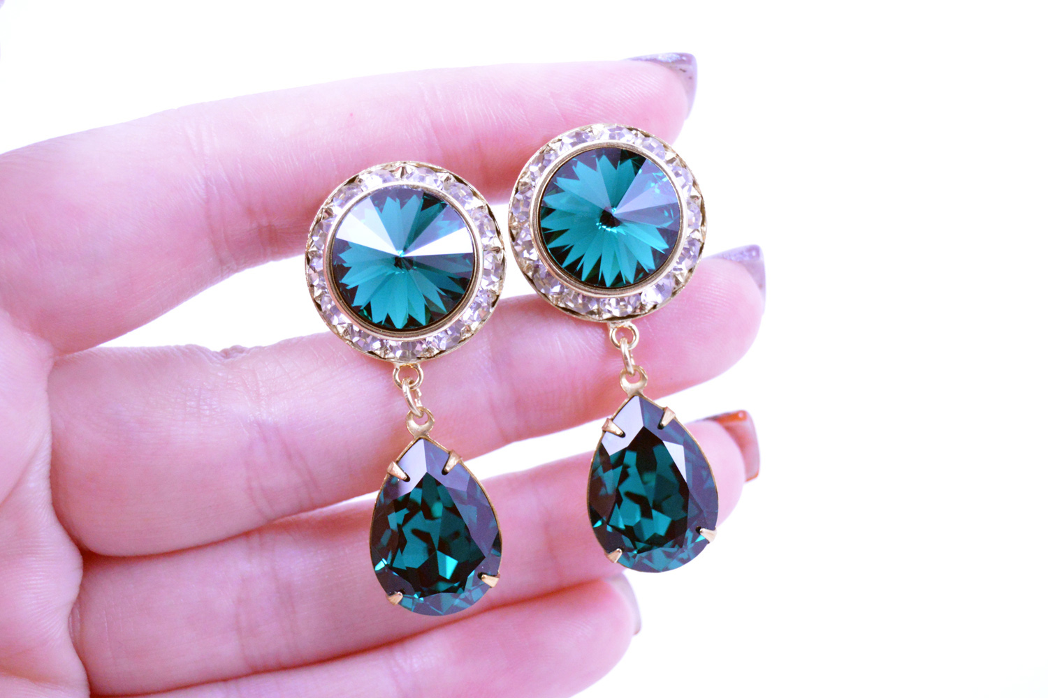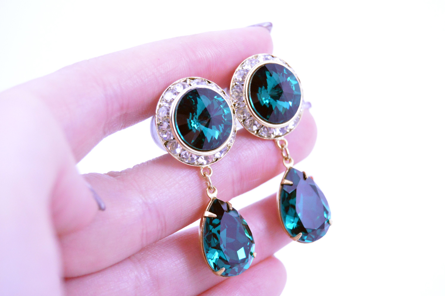 5/8 9/16 1/2 Emerald Green and Gold Dangle Hanging Ear Plugs Gauges Tunnels or Studs Made With SWAROVSKI Elements Wedding Bridal